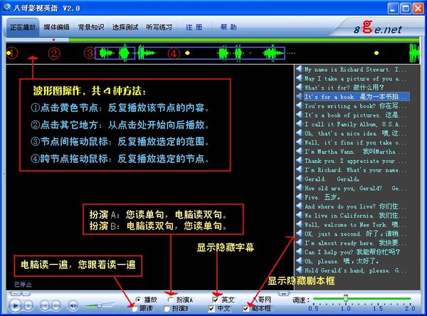 八哥影视 图示 除了具备普通播放器的功能之外,而专门针对英语学习增加了大量非常的实用、而对英语学习来说又非常必要的功能,支持所有流行的影音文件格式(rm/rmvb/mwv/mwa/mp3/avi/mpg…),打开影音文件后程序自动生成波形图,全程可视化波形图操作;支持智能插入断点,学习进度自动保存,并且可以随机生成测试选择题、以及精确到句子的剧本听写等。