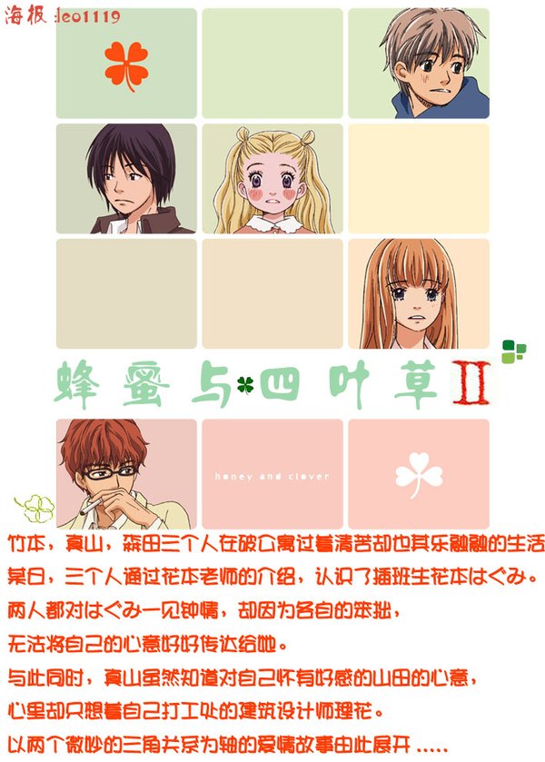 【片名】蜂蜜与四叶草2(Honey&Clover 2) 【字幕】DmzJ字幕组 【格式】avi+rmvb 1280x720 为宽屏版 【内容介绍】 2005年7月曾经轰动一时的小众向动画《蜂蜜与四叶草》终于将要推出第二季了!它将作为4月新番《兽王星》的后番,最早今年7月播放。动画原作改编自 由网络漫画家成长起来的羽海野チカ的同名漫画,目前连载于集英社月刊《YOUNG YOU》,同样也是在最新一期的《YOUNG YOU》5月号上公布了年内即将播放TV版第二季的消息。 与TV动画同期送上的还有真人版电影的消息,目前一切已经准备齐全,并开始在日本各地展开宣传攻势,为暑假的上映推波助澜。 《蜂蜜与四叶草》于2005年7月在富士台全新设置的,以年轻上班族女性观众为主要收视群体的“NOITAMINA”频道首播,也是该频道第一弹动画作品,故事以5个美校大学生的校园生活为主线,清新淡雅,幽默温馨,赢得了不少年轻上班族,以及在校大学生的好感。其时尚的创意和积极的生活方式也得到了广泛的认同,所以在TV版第一季24话播放之后,很快决定投拍真人电影。这次锦上添花的TV版第二季不知是否能带给我们同样的惊喜和感动呢?