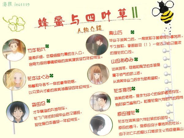 【STAFF】 原作:羽海野チカ(月刊「YOUNG YOU」连载中 / 集英社刊)  监督:カサヰケンイチ 脚本:黑田洋介 キャラクターデザイン:岛村秀一  アニ メーション制作:J. C. STAFF オープニング映像:野田 凪 衣装监修:仓石一树 製作:ハチクロ製作委员会 【Cast】 竹本祐太:神谷浩史  花本はぐみ:工藤晴香  森田忍:うえだゆうじ 山田あゆみ:高桥美佳子 真山巧:杉田智和  花本修司:藤原启治  原田理花:大原さやか 【人物介绍】