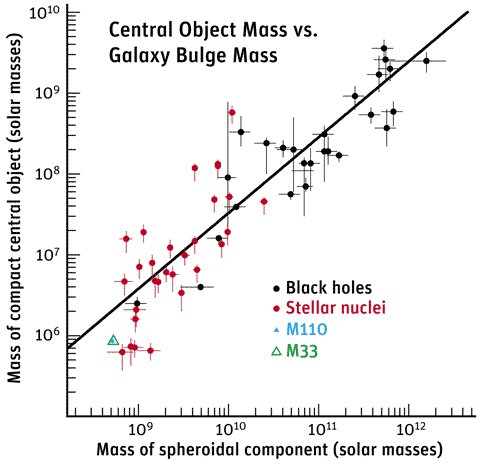 图片说明:星系中心的致密天体与星系球状结构的关系图。图中的纵坐标是中心致密天体的质量,横坐标是星系球状结构的质量。黑色数据点表示黑洞,红色数据点表示恒星状核心,M110和M33则用特殊的符号标出。从图中可以看到, 它们的质量都满足了同一种比例关系。Source: Laura Ferrarese. 这个结果暗示,所有的星系也许都会形成致密的中心天体——不是一个超大质量黑洞,就是一个致密的星团——它们大约包含了星系球状结构质量的0.2%。这个小组推测,致密的恒星状核心可能是“流产的黑洞”——这个系统中的物质没能一直坍缩成自然界的终级深渊。这个结论还得到了 另一项研究工作的进一步支持,那项研究是由伊丽莎白·韦纳(Elizabeth Wehner)和威廉·哈里斯(William Harris,加拿大麦克马司特大学),还有约恩·罗萨(Joern Rossa,美国太空望远镜科学研究所) 共同完成的。 “我们发现这个结果时相当兴奋,因为我认为,它为星系形成之谜增添了另一份重要的信息,”费拉雷斯说。“致密核心与超大质量黑洞一样,是星系的一个基本组成部分。解释它们的形成过程,也许可以为星系本身的形成机制提供重要的线索。” 视频预览: http://www.bt2008.net/bbs/attachments/month_0606/snapshot20060610181302_DWeZKZUwpRPM.jpg 视频预览: http://www.bt2008.net/bbs/attachments/month_0606/snapshot20060610181650_O0QqczhT24qo.jpg 感谢