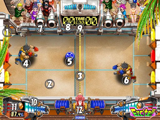 ① 得分点。 ② 空地。不用说了,让飞盘落到空地上也不行的。 ③ 网。 ④ 1PLAYER ⑤ 飞盘 ⑥ 2PLAYER ⑦ 获胜场数 ⑧ 得分。先到15分的获胜 ⑨ 剩余时间。初始999~~~毫秒 ⑩ 能量槽。必杀技消耗 ⑪ 感觉还是能量槽。100% 时可使用超必杀 ⑫ 这个是~~~裁判。 --------------------------------------------------------------------------------------- 出招就不贴了 角色都是使用C键出必杀 只是分持球(盘)和未持球(盘) 在空中使用和在地面使用几种组合罢了 超必杀~~我没练出过,手笨 大家看游戏帮助吧。 ----------------------------------------------------------------------------------------- 游戏截图: