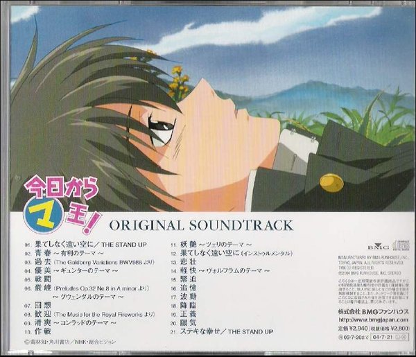 TVアニメ「今日からマ王!」オリジナル・サウンドトラック アニメサントラ http://www.neowing.co.jp/pictures/s/02/14/CRCP-40127.jpg 商品番号: CRCP-40127 メディア: アルバムCD 組枚数: 1 発売日: 2005/11/02 価格: 2700円(税込) アーティスト/ キャスト THE STAND UP (アーティスト)  坂本タカノリ (作詞者)  太田タケヒロ (作曲者)  吉川洋一郎 (作曲者)  ラフマニノフ (作曲者)  ヘンデル (作曲者)  内容 NHK教育TVで放映の人気アニメ「今日からマ王!」のオリジナル・サウンドトラック!! ジャケットをリニューアルして再発売!! アニメーション音楽を手掛けているのは山海塾の音楽監督として世界的にも知られる吉川洋一郎氏。デジタルサウンドと生オーケストラを融合させたハリウッドテイストを彷彿とさせるサウンドとなっている。サウンドトラックは書き下ろされた百数十曲の中からスケール、テイストを吟味し15曲を選曲。スタート曲にはオープニングテーマ曲「果てしなく遠い空に」(THE STAND UP)を、クロージングにはエンディングテーマ曲「ステキな幸せ」(THE STAND UP)を収録!!
