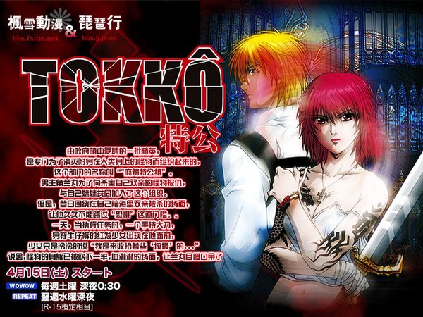 【片名】特公 【字幕】枫雪动漫+琵琶行字幕组 【格式】RMVB 【内容介绍】   由藤泽亨原作的漫画《TOKKO特工》(已完结,全3卷)在去年暑假相信不少人已经获悉这部“打女动作漫画”将要在今年4月改编成动画,日前在官方网站上也放出了最新消息,公布了两张主要任务的造型,已经确认了动画的具体播映日期,详细日期为:在3月24日深夜1点34分将在WOWOW电视台播映长达30分钟的动画先行介绍片段(PART1),之后在3月25日,同样在WOWOW电视台,即晚上10点54分播映动画先行介绍片段(PART2),PART1~2将会在3月30日重播,之后第二天即将迎来动画的第1话《TOKKO特工》——命运的相遇。4月新番争势势必很有看头~~   由政府暗中受聘的一批精英,是专门为了消灭附身在人类身上的怪物而组织起来的,这个部门的名称叫“"麻辣特公组”。男主角兰丸为了向杀害自己双亲的怪物报仇,与自己妹妹共同加入了这个组织。但是,昔日围绕在自己脑海里双亲被杀的场面,让他久久不能跨过“恐惧”这道门槛。。一天,当执行任务时,一个手持大刀,身穿牛仔裤的红发少女出现在他面前,少女只是冷冷的说“我是来收拾着些‘垃圾’的。。。”说罢,怪物的身躯已被砍下一半,血淋淋的场面,让兰丸目瞪口呆了 【官方网站】 http://www.wowow.co.jp/anime/tokko/