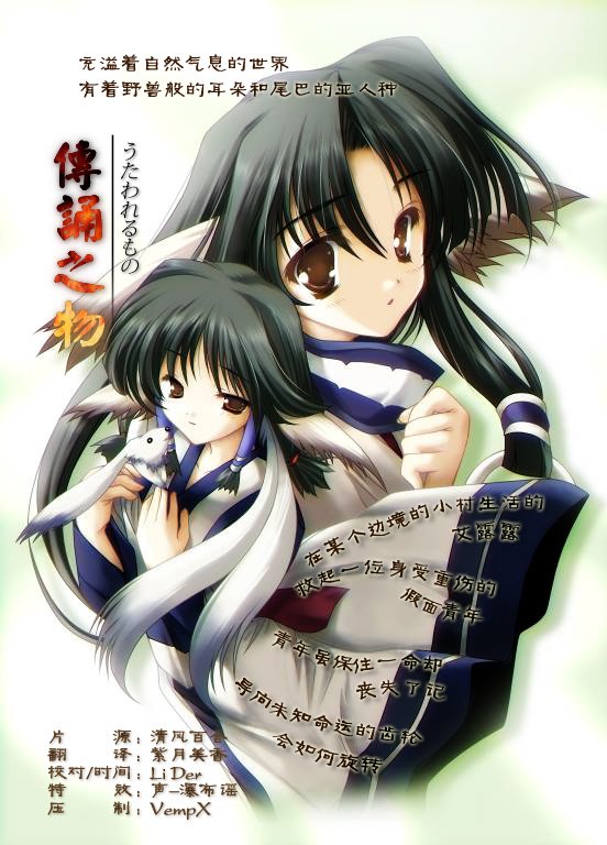 【动画官网】http://www.utaware.net/ 【动画大小】100M左右/话 【动画格式】RMVB 【字幕语音】日语配音 中文字幕 【播放软件】ReaPlayer 暴风影音 【Staff】 原作…………………………AQUAPLUS 监督…………………………小林智树 シリーズ构成………………上江正彦 プロップデザイン……………深沢幸司 美术监督……………………加藤贤司 色彩设计……………………大関たつ枝 撮影监督……………………水谷贵哉 音响监督……………………明田川进 アニメーション制作…………OLM TEAM IWASA 製作…………………………うたわれるもの製作员会 【Cast】 ハクオロ……………………小山力也 エルルゥ……………………柚木凉香 アルルゥ……………………沢城みゆき トゥスケル…………………京田尚子 オボロ………………………桐井大介 ユズハ………………………中原麻衣 ドリィ/ グラァ……………渡辺明乃 テオロ………………………石川ひろあき ソボク………………………雪野五月 べナウィ……………………浪川大辅 カロウ………………………小山刚志 ウルトリィ…………………大原さやか カミュ………………………钉宫理恵 カルラ………………………田中敦子 トウカ………………………三宅华也 ヌワンギ……………………吉野裕行 【故事简介】 故事舞台大半都是被树木等等自然风光所围绕的世界 那里居住着外观和人类极其相似的,有着野兽一般的耳朵和尾巴的亚人种 故事是在某个边境的小村生活的艾露露,她救了一个受了重伤的假面青年而开始 青年虽然侥幸保住一命,却丧失了以前的记忆 他被艾露露的祖母多斯库鲁取了个名字叫“哈库奥罗” 而且这次相遇将他们导向了跌宕起伏的命运之中