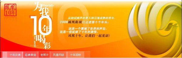 尊敬的曾荫权特首,尊敬的董建华副主席,尊敬的高祀仁主任,尊敬的吕新华特派员,亲爱的在场的,不在场的,以及电视机前的凤凰卫视的朋友们,大家晚上好。 感谢你们在这个美好的夜晚和凤凰人一起欢度凤凰的十年庆典,十年前的3月31日,凤出于香江。 凤凰的崛起主要是由于中华民族的崛起。过去的十年是百年不曾有过的中国人的机遇,正是借着这股风,凤凰才能鹏程万里,飞遍全球。 十年树木,凤凰从幼苗破土成长为植根于中华大地的参天大树,他的成功更靠朋友们的帮助,观众朋友们的目光就是我们的阳光,父老兄弟们就是我们的语录,正因为如此,我们一直以为凤凰不单单只是凤凰卫视的凤凰,凤凰卫视是大家的凤凰,它属于四海一家,我们中华民族的大家庭。 十载凤凰十载恩,今晚在场的朋友从世界各地来到这里,今晚不在场的朋友们也在世界各地注视着这里,流淌在我们凤凰人心中的感情第一是感谢,第二是感激,第三是感恩。 我想起一句话:桃李春风一杯酒,江湖夜雨十年灯。今晚我们要拿出所有的鲜花和美酒感谢朋友,祝福朋友,感谢香港,祝福中国。谢谢!