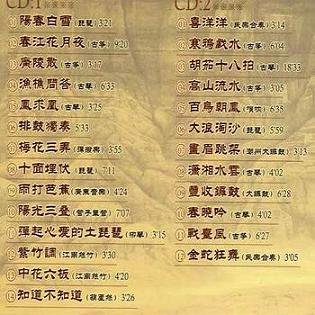 : A 01 阳春白雪(琵琶) 02 春江花月夜(古筝) 03 广陵散(古筝) 04 渔樵问答(古琴) 05 凤求凰(古琴) 06 排彭独奏 07 梅花三弄(弹拨乐) 08 十面埋伏(琵琶) 09 雨打芭蕉(广东音乐) 10 阳光三迭(管子单管) 11 弹起心爱的土琵琶(柳琴) 12 紫竹调(江南丝竹) 13 中花六板(江南丝竹) 14 知道不知道(葫芦丝) B 01 喜洋洋(民乐合奏) 02 寒鸦戏水(古筝) 03 胡茄十八拍(古琴) 04 高山流水(古筝) 05 百鸟朝凤(唢呐) 06 大浪淘沙(琵琶) 07 画眉跳架(潮州大锣鼓) 08 潇湘水云(古琴) 09 丰收锣鼓(大锣鼓) 10 春晓吟(古琴) 11 战台风(古筝) 12 金蛇狂舞(民乐合奏) 本专辑已加入MP3共享计划!