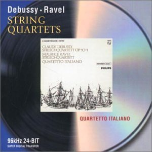 德彪西和拉威尔都只写了一首弦乐四重奏,却都是他俩各自的重要室内乐力作。尤其是德彪西的一首,承上启下,不仅引出他本人音乐个性的发展和转进,对后世四重奏创作也影响深远。此曲用g小调写成,表面看来仍是传统的四乐章形式,但骨子里,抱负和手段是整个的不同了。他的旋律是复杂而非歌唱性的,感官层面上有点懒洋洋的,和声的风格介乎清亮和缥缈之间。第二乐章拨奏的铿锵和第三乐章的缠绵形成鲜明对照。在一个精准而富有生气的演奏中,这一切都会熠熠生辉。意大利四重奏组这个演录,正是在这变化多端的表情中刻划着每一个细节的。德彪西的音乐要求人们对他精雕细琢,不然你会漏掉许多东西。