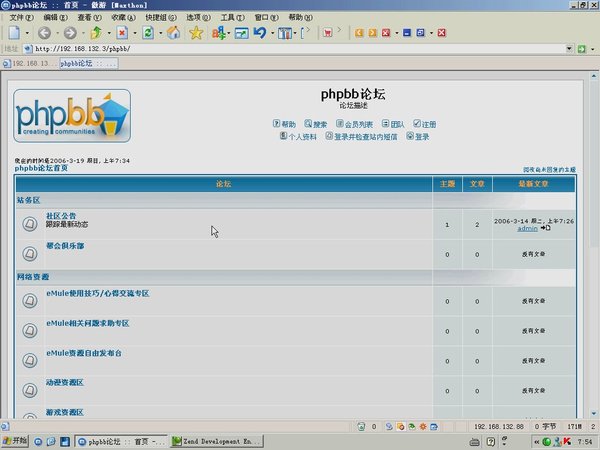 phpBB 2是一个论坛软件,使用PHP语言开发的并开放其原始码。是模块化设计,具专业性、安全性高、支持多国语系、支持多种数据库和自定义的版面设计等优越性能,而且功能强大。 本教程通过对PHPbb程序的分析,使广大PHPer熟悉一般论坛程序的开发过程,了解PHP语言的基本知识和算法的实现。 作者:刘铭,PHPer,从事PHP网站的程序设计开发,希望通过此种方式能够和更多的PHPer多多沟通。由于是第一次做这样的视频教程,如果有做得不好的地方请大家见谅。先将联系方式写在下面,希望大家多多交流。 msn: liumingl@hotmail.com 电子邮件: http://services.nexodyne.com/email/icon/4J29BHHEW08%3D/EIHGZSc%3D/R01haWw%3D/0/image.png 已通过安全检测: 安全检测软件软件:McAfee VirusScan Enterprise 版本号:8.0.0 病毒库日期:2006-3-20 常在服务器:Razorback 2.4 在线时间:工作日8:00~16:00
