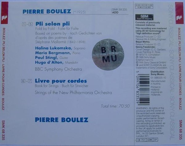 这张唱片上的女高音和乐队的《重重皱褶》是布列兹迄今为止篇幅最大,成就最突出的杰作,演出历时整整一小时。此前布列兹曾作《三首马拉美即兴曲》,后来又在那三首即兴曲(《纯洁、鲜活和美好的今天》、《旧花边的碎片》和《云层压抑下的静默》)的前后各加一首《礼物》和一首《坟墓》,凑成五个乐章,歌词全部选自法国象征主义大诗人马拉美的即兴诗集,而《重重皱褶》这个标题也是取自马拉美的一首诗。马拉美在那首诗里描写了布吉斯的城墙随浓雾消散而渐渐显现,这个诗的手法启示了布列兹,用一系列色彩闪烁、游移不定而非常感官化的音响乃至噪音去逐步揭示诗的意趣,这样,“重重皱褶”就变成了“层层展现”。