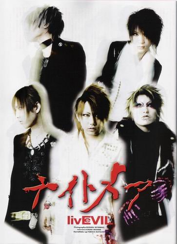ナイトメア于2001年1月结成,他们主要以出生地仙台作中心活动。 成员有yomi(vo),ni~ya(ba),柩(G),咲(xiao)人(G),榴樺(Dr)五人。 最先的领导人是咲人,在咲人还是高校生的时候,故乡举行了一个类似文化祭的活动,在那里他便认识了柩。 接着柩便向咲人提出组乐队的要求,名字是nightmare。然后便开始寻找主唱(yomi),贝斯(ni~ya),和鼓手(Dr.サポート)。 改名为ナイトメア。瑠樺是在前任鼓手走了后(2001年1月),才决定同咲人他们的请求,加入进来的。 —Vocal – 名字: Yomi 生曰 : 1981,7,14 血型: A 身高 : 158cm 体重 : 45kg 家庭成员 : 父母 ,弟弟 个人代表色:黄 喜欢的食物:荷兰芹 烟的牌子:禁烟中 尊敬的人:没有特别的 早上起床第一件事情:洗澡 回家第一件事情:脱衣服 - Drum - 名字 : 瑠樺(ruka) 生曰: 1979,6,9 血型 : O 身高 : 183cm 体重 : 60kg 家庭成员 : 祖父母,父母 ,弟弟 个人代表色:粉红 喜欢的食物:炒饭,咖喱 烟的牌子:i cene 尊敬的人:kyo,kisaki 早上起床第一件事情:听音乐 回家第一件事情:换衣服 Guitar – 名字: 咲人(sakito) 生曰: 1981,6,29 血型: O 身高 : 172cm 体重 : 52kg 家庭成员: 父母 个人代表色:黑色 喜欢的食物:炒面 烟的牌子:jps box 尊敬的人:sugizo 早上起床第一件事情:和太阳说话 回家第一件事情:说“啊” - Bass - 名字 : Ni~ya 生曰: 1981,6,23 血型: A 身高 : 177cm 体重 : 55kg 家庭成员 : 父母, 哥哥,妹妹 个人代表色:蓝色 喜欢的食物:啤酒 烟的牌子:cool mild box 尊敬的人:taiji,J,geroge 早上起床第一件事情:抽烟 回家第一件事情:听音乐 - Guitar - 名字: 柩 (hitsugi) 生曰: 1982 ,3,5 血型: AB 身高 : 165cm 体重: 45kg 家庭成员: 父母 ,两只猫 个人代表色:红色 喜欢的食物:pizz 烟的牌子:seven star 尊敬的人:hide 早上起床第一件事情:抽烟 回家第一件事情:脱鞋