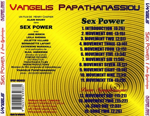 这是一张十分稀有的专辑,因此,它也是一张价值连城的唱片!虽然创作时间早于the Dragon 和 Hypothesis,但是风格却不似这两张那么愤青。演奏的主要乐器是吉他,偶有几个电子音节。 当有人为了追寻这张唱片,而找到电影Sex Power的导演Henry Chapier(一位着名的法国小说家)时,他回答说,这部影片的拷贝已经不知道流落到什么地方了,他更奇怪为什么这么久了,怎么还会有人对其中的配乐感兴趣?他哪里知道,这张在他眼中不值一文的普通配乐就是大师vangelis的处女作啊!