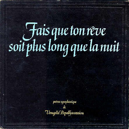 这张法语专辑可直译为:愿做一个比夜还长的梦。一张为了纪念1968年,法国巴黎左翼学生运动的专辑。音乐就像是新闻稿,广播稿,民歌,钢琴曲和实景组成的七色板:采用了一点合成器声,为的是表现对那个激进年代的悼念。一些歌词选自当时街头的大字报。 黑封皮的那张专辑首发之后,又发行了橘黄封皮的那张。不幸的是,这张专辑从未发行过CD版本。 整张作品更像是一场没有对白的广播剧。枪声四起、冷风呼啸、警笛阵阵,巴黎的街头远远地传来青年学生的齐声高歌,那是一种最自然的,又蕴含无穷力量的抗议。之后,一直是音乐和实地声响的混合,描绘出一幅历史感十足的风情画。虽然没有控诉、没有批判,但VANGELIS的政治立场已经通过音乐完美地表达出来。 《愿你的梦想比夜晚更长》,可以说是VANGELIS的第一部史诗作品,尽管格局尚小,但其远大视野和独特乐思已出现在地平线上。