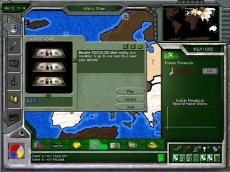 另外游戏还提供了一种直接行动卡(DAC),包含了很多意外事件或者一些非法行动,它常常能在关键时候甚至大局快定之时扭转局势,令游戏产生了更多的偶然性。总之,玩家将在游戏中体会到真实的商业竞争,学习到很多有用的经营之道,游戏同时支持最多八人的网络对战,这下中国玩家又有了相互一较高下的机会,以决出谁更有商业头