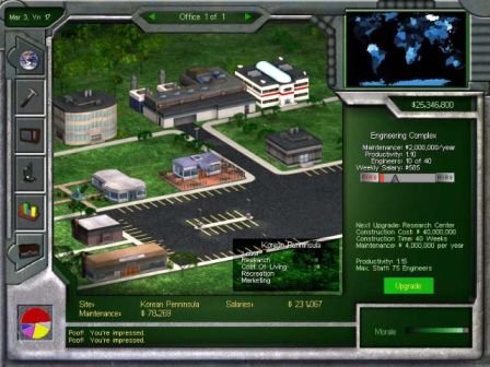 游戏一开始玩家就要选择竞争对手的数目和公司启动资本的数量,以及自己将要进入的行业。虽然目前游戏只有三个行业可以选择,不过Stardock承诺以后会在网站上发布更多。最后玩家还要为自己的公司选定一个核心业务(销售、研究、生产),也就是确立公司擅长的方面,这可以为你在游戏初期确立该方面的优势。