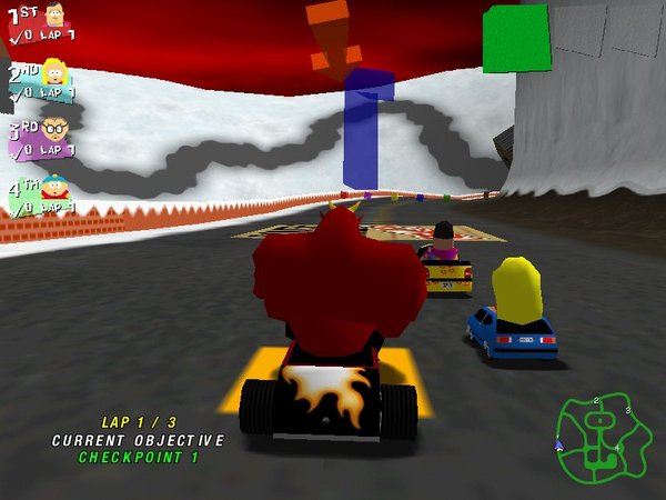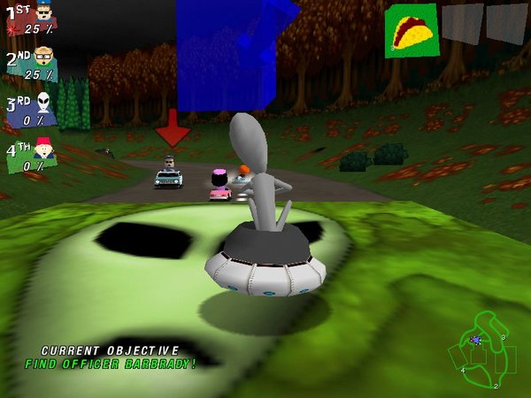 故事仍然发生在那个阳光明媚的小镇中,不过这次没有什么外太空的邪恶势力入侵或者大堆泛滥成灾的火鸡来惊动我们那4位可爱的小英雄了。小镇的居民们为了庆祝一年之中各种各样的节日,不厌其烦地举办各种主题的赛车活动,玩家的任务就是在这些赛车活动中击败对手。游戏中共包括了14关,每一关就是小镇居民为庆祝一个节日举行的赛车活动,针对不同的节日,这些赛车活动都有不同的任务要求,因此玩家在游戏中要做到的不仅仅是努力取得在赛车中的领先地位,更要想方设法完成相应的任务。只有在一个节日的赛事中取得了第一,玩家才能够进入下一关,直至最后见到这个小镇的黑暗王子。游戏中包括的节日都是些希奇古怪的日子,而为这些节日设计的任务也是匪夷所思。在奶牛节(Cow Day)中,所有的小镇居民都被疯牛病所侵扰,而唯一的一瓶疫苗只能由赛车活动决定归属;而在情人节中,获胜者必须用情人箭射中所有的竞争对手;在感恩节中则要想方设法尽快收集20只火鸡(《南方公园》的制作者上辈子肯定是吃火鸡噎死的)。玩家在赛车过程中可以选用多种武器打击对手来“杀出一条血路”,千万不要认为这一点有违公平竞争的原则,因为你的对手也会毫不留情地打击你,所以要赢得游戏,必须时刻提醒自己“对敌人的仁慈就是对自己的残忍!”。习惯了在《极品飞车》或者《摩托英豪》中专心驰骋的玩家看来得需要一些时间来适应这种“残酷”的赛车模式了。在游戏进程中,只要玩家用自己的武器击中了竞争对手,则对手已经完成的部分任务就会打上少许折扣,比如说在感恩节的赛车活动中,如果被对手击中,那么赛手为感恩节收集的火鸡数量便会减少。这一设计似乎无关大局,但实际上却给游戏增加了许多灵活的战术选择:玩家可以以打击对手为主要手段来使自己能够率先完成任务,也可以纯粹以速度制胜,心无旁骛地走自己的路,让别人打去吧!总体而言游戏的设计还是颇有些新意,而且秉承了从卡通片《南方公园》到上一个电脑游戏《南方公园》中一脉相承的那种充满童趣的幽默。