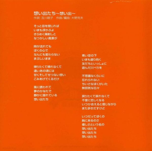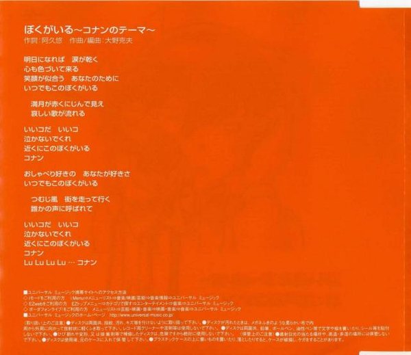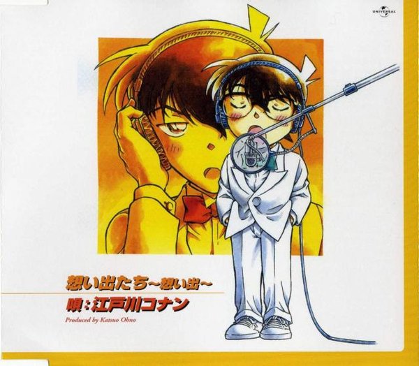 【专辑介绍】 名探偵コナンTV&MOVIE 10周年企画 「想い出たち/ぼくがいる」  唄:江戸川コナン / プロデュース:大野克夫 2005年12月28日 UPCH-5356 人気長寿アニメ『名探偵コナン』の10周年記念企画、第1弾。江戸川コナン名義としては初となる本作、ストーリー中では音痴の設定の彼の味わいを生かしたユニークな楽曲が聴ける。 柯南的金嗓子终于也要出唱片了! 作为名侦探柯南10周年纪念作品之一,CD的曲目方面,选择大家应该耳熟能详的歌曲,选自剧场版的“回忆”与“有我在”。 根据动画片TV通信贩卖的消息显示,这是一张音痴感很足的CD-v- 另外,CD的封面是由青山老师执笔的新图。 【专辑曲目】 1.想い出たち 2.ぼくがいる 3.想い出たち(カラオケ) 4.ぼくがいる(カラオケ) --------------------------------- 1、回忆 2、有我在 3、回忆(卡拉OK) 4、有我在(卡拉OK) 【歌曲歌词】