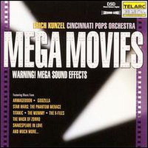 其实,Telarc在几年前就有过此等令人发指的制作。听过他家《Big Picture》的发烧友,一定还没忘记《侏罗纪公园》中那可怖的“恐龙午餐”音效,和《侠盗罗宾汉》中令人躲闪不及的“穿心箭”效果。《Mega Movies》完全是当年这张叫人"闻碟丧胆"的电影音乐唱片的续集。其中除了收录孔泽尔/辛辛那提通俗乐团最新演奏的美国大片:《盗墓迷城》、《空军一号》、《埃及王子》、《X档案》、《泰坦尼克》、《哥斯拉》、《佐罗的面具》、《星球大战前传》、《幕后嫌疑犯》及《虫虫特工队》等16部电影主题改编曲,更呈上6段精心炮制令人匪夷所思的SFX数码音响特别效果,提供较《Big Picture》有过之无不及的听觉震撼。