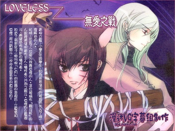 喜欢LOVELESS,感觉它跟其他BL作品不一样,从人物性格到故事设定。整个作品气氛有让人心酸的但淡淡的又带点甜的爱意。登场的各个人物性格个性分明,故事情节紧张。很让人一步一步看下去。还有让人印象深刻的是,那一群可爱的猫耳朵,猫尾巴。主人公都猫化了。难怪作者高河小姐要自嘲自己,都在这么发达的21世纪了,竟然让主人公猫化,自己是哪根神经不对了。赫赫,不过都增添了更多的可爱啊,我觉得。