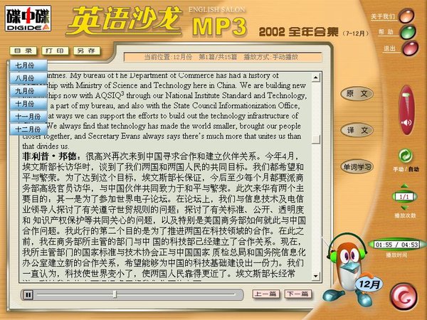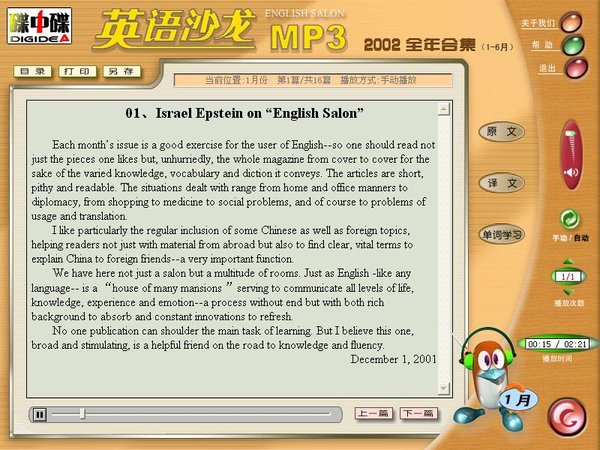 已通过安全检测:Norton AntiVirus 2003 病毒库日期:2005.10.19 常在服务器:Razorback 2.0 在线时间:24小时 偶尔重启(目前R2连不上,请看论坛内相关帖子) 《英语沙龙MP3》整合了进入华盛顿图书馆的中国杂志、入选中国期刊精品库的优秀期刊《英语沙龙》杂志2002年全年12期的全部有声内容。两张CD-ROM。收集了包括人文、社会、科学、体育、时事等内容在内的近200篇文章,集知识性、实用性、趣味性于一体,不论兴趣所在,这里都有能吸引你目光的新奇内容。在丰富自我、开阔视野的同时,全面提升你的英语听力、口语和阅读能力。 本软件功能齐全、使用方便。快捷的目录点播按钮,可在不同月份的文章中随意选择、切换,自行设定文章播放次数。精确的播放时间显示,方便你反复收听感兴趣的片段。每篇文章均有英文、中文、注释、页面内容打印等功能。在单词注释中,可以按文章,或按字母顺序自由选择学习方式。 本软件还特别为使用MP3播放器的用户在学习每篇文章的标题下注明了该篇所对应的声音文件名称,所有声音文件都可在光盘根目录下检索,方便你的使用。 丰富的内容,体贴的设计,就在我们为你营造的《英语沙龙MP3》英语学习新境地。
