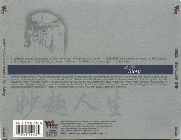 作品集故事 同样是生日相差一天的魔羯座,同样学习古典乐、喜欢爵士乐,也热爱音乐创作的范宗沛和林海,在生命里有许多巧合── 范宗沛从古典乐演奏的背景跨界创作,游走新世纪、世界、爵士及电影等各类型音乐间,以不同型态展现西方古典与东方现代音乐。'98年他曾以「超级公民」获亚太影展最佳电影配乐,并曾获金马奖及金曲奖等多项大奖。林海主修钢琴,曾代表中国参加世界五大钢琴赛之一的van cliburn(范o克莱邦)国际钢琴赛,成为竞赛中唯一入围准决赛的中国人。他集演奏、作曲、编曲、制作等多项才华于一身,新专辑<林海.猫>并入围2001年金曲奖最佳流行乐演奏奖,乐评形容他是「右手东方、左手西方」的天才音乐家。 '94年,范宗沛与林海初次相遇,源于对音乐有相同的喜好,两人成立了music gate工作室,致力于中国新世纪的音乐创作。7年来,他们合作过无数动听的音乐,包括风潮畅销的『心灵音乐诗』系列,这些作品无论抒情或写境,都有独特的东方性灵意境。 为了在新世纪期盼能有新的出发,2001年的开始,范宗沛和林海一同整理了过去的专辑,包括<欲望的声音>、<城南旧事>、<日月西东>等经典作品,这些曲目除了原本以大提琴或钢琴为主的演奏外,另加入小提琴、双簧管、竖笛、