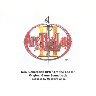 : 1. The Theme of Arc the Lad 2. The Great Natural Disaster 3. Sasha Village 4. Lutz's Theme 5. Intruder 6. Area Change 7. Alec's Theme 8. Battle 1 9. Idio 10. Guild 11. Danger 12. Appreciation 13. The Cave in the Waterfall 14. Battle 2 15. Decision 16. Comical Music 17. The Abandoned House 18. Free Battle Area 19. World Map 20. Port Town Reno 21. Deo's Theme 22. The Monster Coalition 23. The Holy Palace 24. Sadness 25. The Town of Vernicca 26. Sister Liza's Farm 27. Happiness 28. Battle 3 29. The Gathering of Association 30. Item's Association 31. Weapon's Association 32. Gielsem 33. Sheryl's Theme 34. Academy 35. Shu's Theme 36. Testa 37. Battle 4 38. Tosh's Theme 39. Pandira 40. Battle 5 41. Peissus 42. Marsha's Theme 43. Academy of Magical Sciences 44. Battle 6 45. Baltoss 46. Verheart's Theme 47. Baltoss Battle Arena 48. Rage 49. Professor's Theme 50. Labyrinth 51. Henrietta's Theme 52. WAY TO THE EARTH 53. Ferato 54. Cape Erbo, Underground Ruins 55. Elk's Theme 56. Battle 7 57. Last Battle 58. WAY TO THE EARTH (English Version) 59. The Theme of Arc the Lad (Slow)
