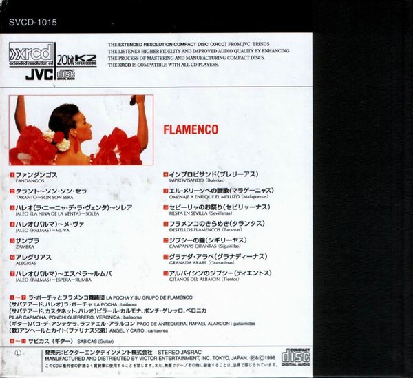 普通版的《弗拉门戈》(CD编号SVCD-1011)已经推出好几个年头,以其发烧级的录音在众多发烧友中间有着很好的口碑。该CD被誉为最发烧的弗拉明戈音乐,吉他晶莹剔透,响板定位准确,舞台踏步动态凌厉,低频冲击力刺激劲爆,是试听低频瞬态效果的天碟。若用大口径音响欣赏,那种迫力和气势令人拍案叫绝,而小书架音箱就未能充分发挥其过人音效。1998年,JVC以XRCD技术对此碟母带进行处理后再版,CD编号为SVCD-1015。收入西班牙弗拉门戈乐曲14首,前7首是节奏强劲、风格狂放、动态凌厉的弗拉门戈舞曲,后7首则是旋律柔和、以抒情见长的弗拉门戈慢板吉他独奏。乐器、人声、掌声有着极真的质感,透明度、结像力、空间感、纵深感极佳,弱音细节清晰丰富,舞台的3D感活灵活现,动态表现凌厉无俦,这一切都足以使它跻身于发烧名碟之列。