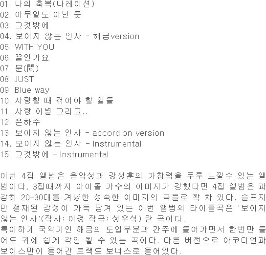 : 01.我的祝福 02.好象什么事都没发生 03.除此之外 04.看不见的问候 05.With you 06.结束了吗 07.问 08.Just 09.Blue way 10.恋爱时应经历的事 11.爱情 离别 还有... 12.银河水 13.看不见的问候(accordion ver.) 14.看不见的问候(inst.) 15.除此之外(inst.) 附增:Myhero [2004年网络单曲]