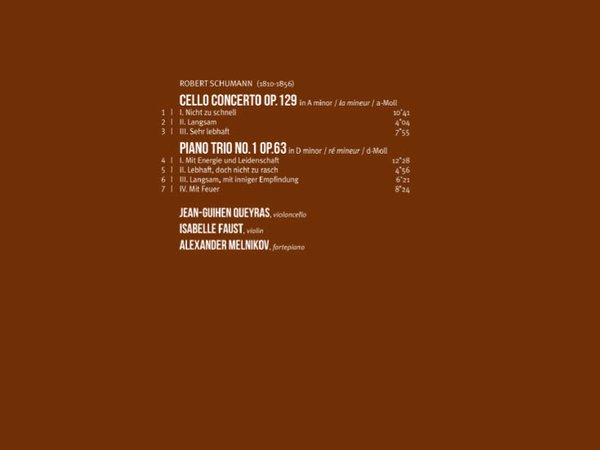 : 01. Robert Schumann: Cello Concerto in A minor, op. 129 - Nicht zu schnell 10:42 02. Robert Schumann: Cello Concerto in A minor, op. 129 - Langsam 4:04 03. Robert Schumann: Cello Concerto in A minor, op. 129 - Sehr lebhaft 7:56 04. Robert Schumann: Piano Trio No. 1 in D Minor, Op. 63 - Mit Energie und Leidenschaft 12:29 05. Robert Schumann: Piano Trio No. 1 in D Minor, Op. 63 - Lebhaft, Doch nicht zu rasch 4:56 06. Robert Schumann: Piano Trio No. 1 in D Minor, Op. 63 - Langsam, mit inniger Empfindung 6:21 07. Robert Schumann: Piano Trio No. 1 in D Minor, Op. 63 - Mit Feuer 8:24