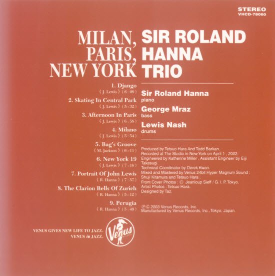 罗兰.汉纳爵士三重奏:寻找米兰、巴黎、纽约约翰.路易斯 Sir Roland Hanna Trio: Milano, Paris,New York finding John Lewis (CD) 【Venus】