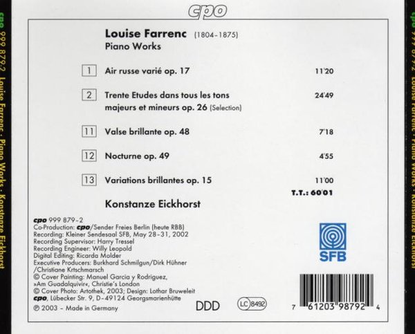 这张专辑仍然是一张Solo Piano,由一位优秀的女性作曲家,法国的路易斯·法仑克(Louise Farrenc,1804—1875)作曲.作为一位生活在19世纪的女作曲家,能发行自己的作品可以说相当难得,这可能主要取决于其丈夫是发行商吧,并且能在大学教授钢琴课.
