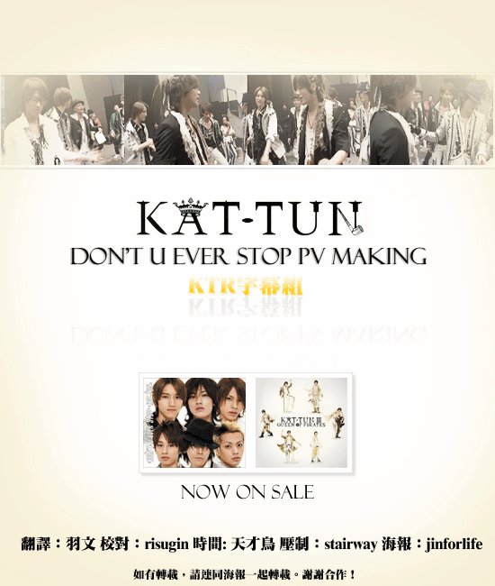 以上字幕由KTROOM字幕组制作627M,AVI格式,此处不提供RMVB和其他格式~因为就清晰度比较会差很多! PS:让MINA久等了~~其实字幕版本的早就有了~只是本人要求比较高~偶也是下了N个版本的字幕作品各种格式的啊~狂汗下~最后把个人觉得较清晰版适合收藏用的放出来~加上这几天私人事情太多没怎么在家停留~所以拖了点时间~现在放出来~MINA好好欣赏吧~有什麽问题的可以加我QQ:228966319(著名ED)也欢迎喜欢KAT-TUN和NEWS的亲们!