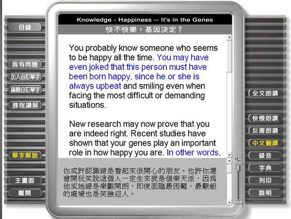 很多人学了很多年英语,但真正要使用时却又提不起勇气,变成满脑子英语却不是满嘴英语, ALL+ 互动英语每月内附电脑影音互动光碟,针对听说读写设计实用功能,所有会话场景聘请外籍演员真人实景演出,让您置身於最真实的学习情境,快慢朗读、录音练习、语音辨识、全民英检模拟测试等实用功能,提供最佳的实际演练环境,可随时练习,效果再加倍,让您随时随地英语脱口而出。