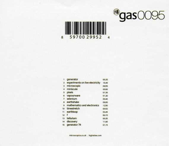 : 01. Generator (0:35) 02. Experiments On Live Electricity (16:40) 03. Microscopic (9:55) 04. Miniscule (0:01) 05. Pixels (1:30) 06. Vapourware (1:30) 07. Selenium (0:40) 08. Earthshake (9:00) 09. Mathematics And Electronics (12:50) 10. Timestretch (0:02) 11. Earthloop (3:45) 12. F (0:15) 13. Tellurium (0:35) 14. Discovery (11:00) 15. Generator 74 (1:15)