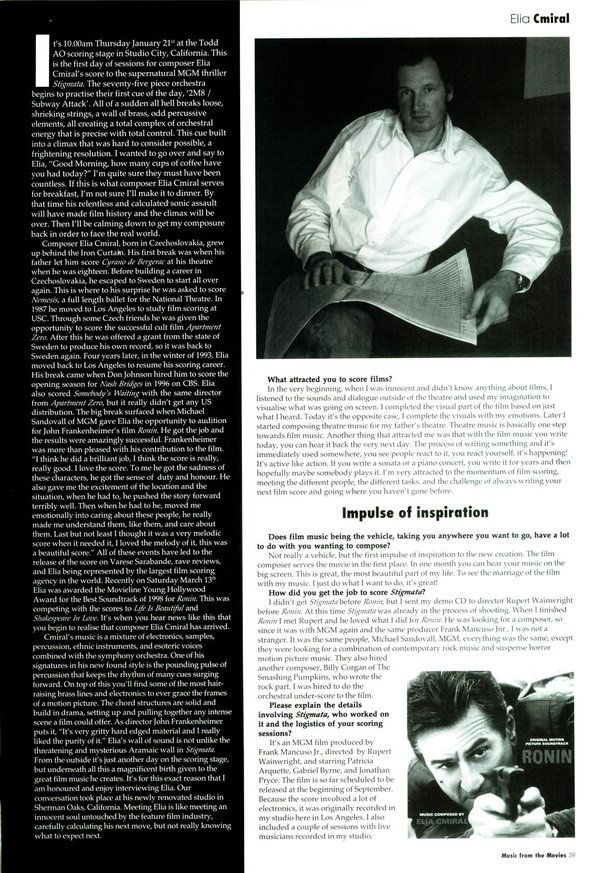 Elia Cmiral在国内不是很有名,作品不是很平凡的出.以下是本人一点粗略的翻译,大致可以去了解一下. Elia Cmiral出生于捷克・斯洛伐克.出生在一个剧场音乐家的家庭.也是Antonin Dvorak's pupils的孙子.他是一位多元化的音乐家.起初,他与他的父亲一起为Cyrano de Bergerac做了电影配乐小样.从中获取了启发并积累了经验,为他之后登上配乐的舞台奠定了基础. 80年代早期,Elia Cmiral搬到了瑞典,在那时候他为欧洲的几部电影,电视剧以及芭蕾做过一些配乐小样.1989年,他再次搬家去了美国,并且在USC的电视节目以及一些电影中做配乐.在美国最初的影片中做配乐恐怕是Apartment Zero了. 经历了10年的锤炼,他在美国以及瑞典开始小有名气了.之后,在Don Johnson's "Nash Bridges"中,他的作品得到大众的肯定.1998年,在Elia Cmiral的第一个音乐工作室里,Elia Cmiral为John Frankenheimer's的电影做了电影原声配乐.当然,原声好,也为这部电影的美国电影演员罗伯特德尼洛和法国电影演员让雷诺画龙点睛.因为原声的成功,1998年,Elia Cmiral被誉为"好莱坞电影界电影原声配乐最年轻的配乐人"荣誉称号. 在最近的十年里,Elia Cmiral为许多独立电影,电视剧和音乐室主修课程等做电影原声配乐.一些最值得一提的有"Stigmata","Wrong Turn," "Journey to the End of the Night," and the "Pulse" trilogy.他的音乐风格是喜欢结合当代电子音乐(电声合成器)等的管弦交响乐团.讲究原声配乐的设计技巧. 近几年,他在Stan Winston and Brian Gilbert监制的电影The Deaths of Ian Stone中担当配乐,并在Mark Young导演的恐怖片Tooth and Nail也做过原声配乐.2008年,他在Splinter中也做了原声配乐. 现在,Elia Cmiral正与他的妻子和两个儿子在美国加州生活. 电影原声的翻译由VeryCD-典狱长翻译,请尊重翻译者的辛勤劳动,谢谢! 本帖属于VeryCD-典狱长首发,转贴时别忘了我