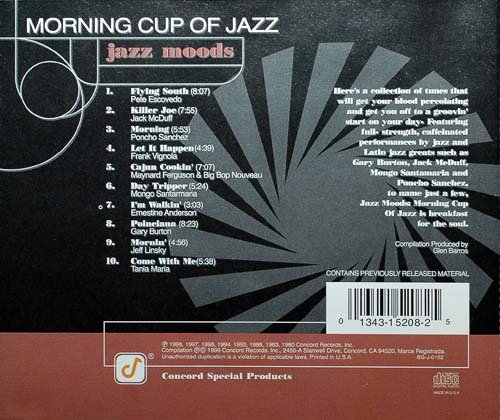"Here's a collection of tunes that will get your blood pereolating and get you off to a groovin' start on your day. Featuring full-strength, caffeingated performances by jazz and Latin jazz greats such as Gary Burton, Jack Meduff, Mongo Santamaria and Poncho Sanchez, to name just a few, Jazz Moods: Morning Cup Of Jazz is breakfast for the soul. --------Compilation Produced by Glen Barros"