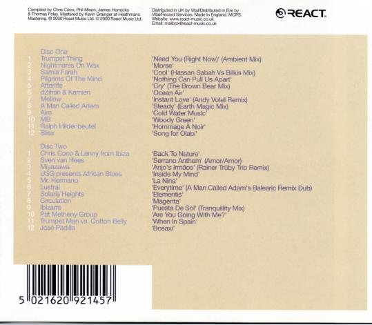 从专辑名称就可看出这套CD其实跟先前的Café Del Mar颇有渊源,甚至可以认为是同一类型的作品,音乐风格是相似的.不同的是这次不再是Café Del Mar来编辑制作,而改由英国电音大厂React发行