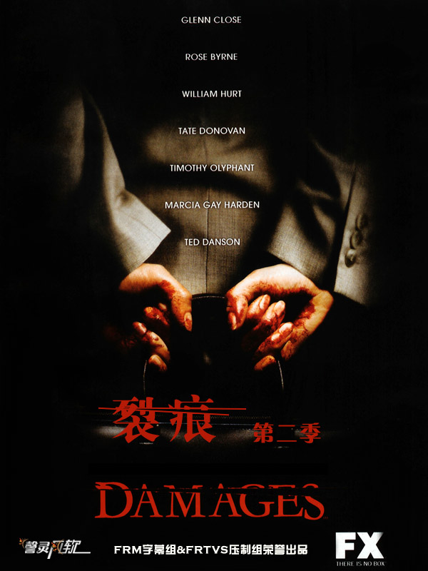 【频  道】:FX 【剧  名】:Damages - 裂痕 第二季 【资料翻译】:Vince@FRMNEWS转贴请注明出处 【首  播】:2009年1月8日 (北京时间 【类  型】:律政惊悚 【每集长度】:50分钟 【主  演】: Glenn Close - Patty Hewes Rose Byrne - Ellen Parsons Tate Donovan - Tom Kent Ted Danson - Arthur Frobisher 【简 介】: Patty Hewes,一个冒着生命危险的诉讼人,国人对她既受顶礼膜拜,又千夫所指;Ellen Parsons,Patty Hewes的年轻弟子,既冰雪聪明,又雄心勃勃.本剧正是围绕着二人的惊险的生活而展开的. 她史无前例地赢了亿万富翁Arthur Frobisher后,Patty Hewes登上了法律界的顶峰.正当她沉思着下一步行动时,Daniel Purcell (William Hurt ,一个从Patty以前神秘的生活中出现的男人,将暴风雨带回她生活里--Patty遇上了一新起的诉讼挑战.案子一开始时还是起家庭谋杀案,但随着Patty捅出个天大的阴谋后,升级成一起触及政府最高层的案子. 同时,Ellen肩负重任--打败Patty她同意做FBI的卧底,以帮助他们侦查Patty和这个律所Patty知道Daniel Purcell的神秘身份后,她必须渡过办公室内和办公室外的雷区. 【人物介绍】: