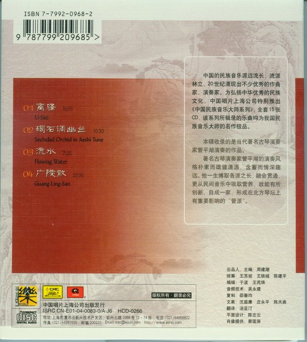 中国的民族音乐源远流长,流派林立,20世纪涌现出不少优秀的作曲家、演奏家。为弘扬中华优秀的民族文化,中唱上海公司特别推出《中国民族音乐大师系列》,全集15张CD,该系列所辑录的乐曲均为我国民族音乐大师的名作极品。 本碟收录的是当代著名古琴演奏家管平湖演奏的作品。 著名古琴演奏家管平源的演奏风格朴素而雄健潇洒,含蓄而情深趣远。他一生博取各派之长,融会贯通,更从民间音乐中吸取营养,故能有所创新、自成一家,形成在北方琴坛上有重要影响的“管派”。 本唱片下载自互联网络,谨对原发布者致以最崇高的谢意! 为了和更多的朋友分享美好的音乐,特以emule格式重新发布。