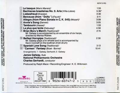 这张被RCA评为“GOLD SEAL”专辑,我非常喜欢。但在网络上找不到相关的介绍和评论,为了不误导大家,各位自行评价吧。 素有“魔笛”之称的爱尔兰长笛大师詹姆斯·高威爵士对古典音乐的表现拥有无人可及的高超技巧,他魅力超凡的演奏几乎超越了所有音乐上的界线。他吹奏出的独特的音色、高深的音乐修养和令人眼花缭乱的演奏技巧使他成为最受尊敬和最出色的艺术家。 多年来,詹姆斯高威用他的笛音掳掠了千万乐迷的心。他横跨了古典、流行、电影、广告配乐等各领域,使长笛独立成主角,悠然游走于各处,他那优异高超的技巧和丰富多变的手法,丰富了长笛的生命(《指环王》中詹姆斯·高威为乐曲营造意境美感,升华雄伟性灵)。   高威的演奏音色特别优美动听,以技艺高超出众而著称,他的音乐特征是因自由辽阔而达到天衣无缝。他有着在贝尔浮特少年时代所形成的那种音乐的自由性和英国正统的演奏风度,再加上与法国优异的长笛奏法的结合,构成他广泛的音乐表现力和丰富多彩的音乐多变性,因此他的音乐优美而感人,演奏风度高尚而完美。他的音乐总是充满喜悦精神。他是现代技巧最高的长笛演奏家,也是最受称赞的艺术家。