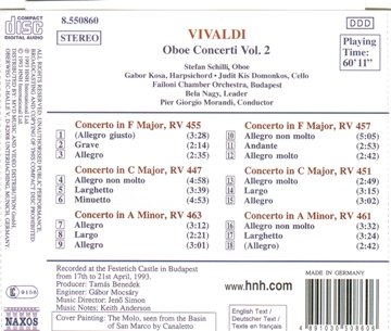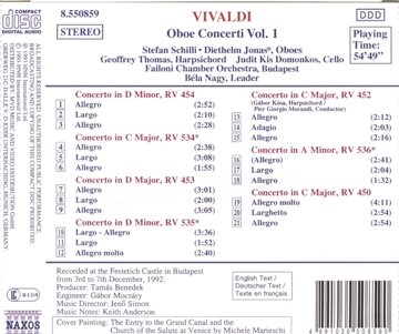 这些布达佩斯的音乐家演奏非常出色,似乎为我们提供了维瓦尔第为双簧管所作的协奏曲的一个概观。《Oboe Concerti Vol.1》奉献了3首,2张片子各有一半独奏作品。独奏家的演奏具有另人吃惊的流畅性和巨大炫技性。一个很好的例子就是RV447的小步舞曲终曲,这是一个回旋曲和主题与变奏的过渡。维瓦尔第巧思迭出,才情似乎从不枯竭,许多简朴的“庄严的慢板”、“小广板”和“广板”的慢乐章确实动听。