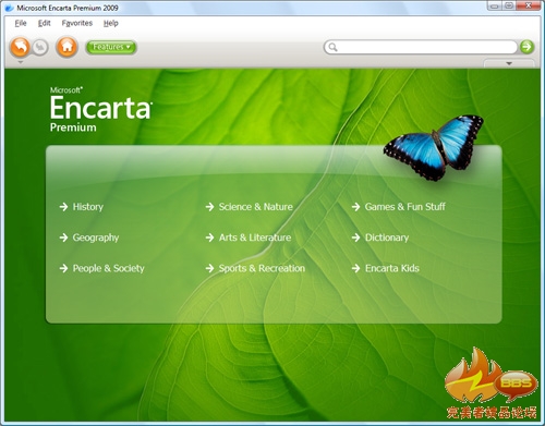 《微软 Encarta 百科全书》是世界最受欢迎的百科全书,它诞生于 1993 年,目前最新的版本为 2009 版。Encarta 与大英百科一样内容丰富,它包含数千万字的专业文字资料,数十万张图片和海量的视频、音频、交互动画等多媒体资源,而且界面华丽,安装、使用相当方便。更为重要的是,微软几乎每周都会为 Encarta 提供在线更新,为使用者送来最新的信息。如果说大英百科凭借其颇具学术价值的文章而成为权威的知识库,那么 Encarta 从综合使用的角度则是目前当之无愧的最佳百科全书。