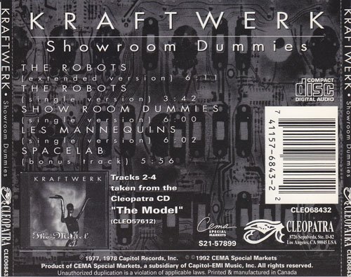 如果你了解 Kraftwerk,你就不会对这两张单曲辑里包含了三个专辑的作品收录感到奇怪,Kraftwerk 曾经在70年代末期面对媒体解释自己音乐的类型时说,我们的音乐是 Robot 类型,呵呵。基于此,不难去从他们的作品中发现,前后出现过三个以此为标杆的作品,The Robot、The Model,和 Showroom Dummies,第一个具有非性别概念的机器感描述,第二个是具有女性化的冷艳,而第三个则是具有男性化莽撞搞怪的味道。放在一起,的确是别有匠心!