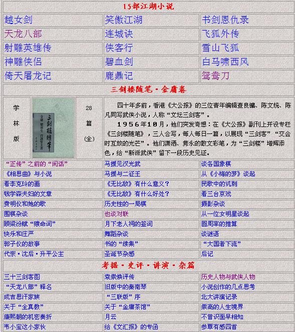 关于本版十五部小说的来源,基本为三联版。编排都是在原有页面文件的基础上进行的再加工(主要是加入了背景和表格边框)。 其实,真正(完整)的金庸作品全集并不算是真正的完整。不过,相对于网上的其他版本,此作品是完整得多了,主要是收入了《三剑楼随笔》。