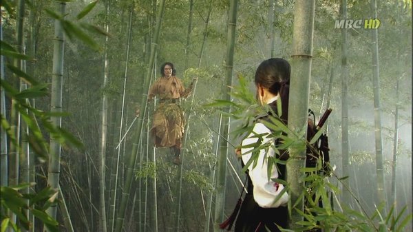 彩玉在江口首次与盛白照面。虽然彩玉女扮男装,但盛白似乎知道她是女儿身,而且武艺高强。 他想知道个中缘由于是偷偷的跟踪彩玉。途中彩玉遇险,偷偷跟踪她的盛白挺身相救,结果被晚到一步的黄甫允误会了, 两人刀枪相见,发现彼此的剑术异常高超…。