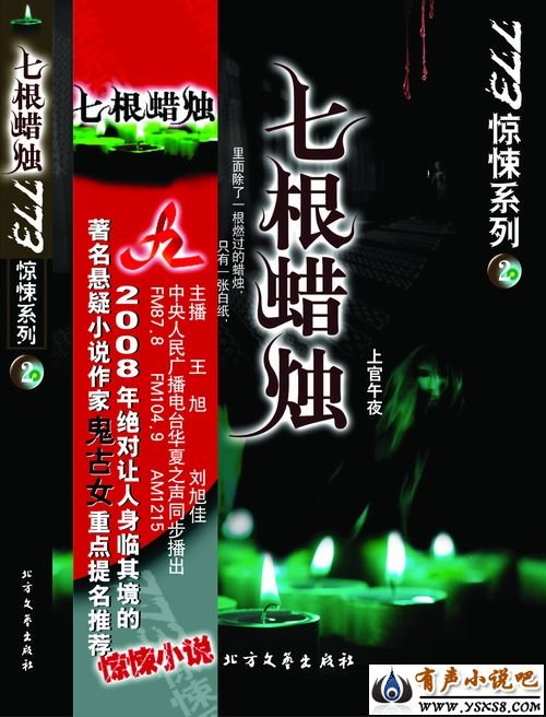 近期,新锐作家上官午夜创作的都市情感恐怖小说《七根蜡烛》由北方文艺出版社强势推出。该书上市以来,稳居各大书店文艺类新书畅销排行榜。在畅销的同时,该书也因其让人身临其境的惊悚悬疑而受到众多网友的热烈追捧,各大恐怖网站超人气点阅。   美女作家再推恐怖小说 :   上官午夜的长篇校园恐怖小说《猫血》曾在网络上好评如潮,被网友们评为“最好看的校园恐怖小说”之一。《七根蜡烛》是上官午夜继《猫血》之后,再度出手。小说延续《猫血》的叙述笔调,加入更精彩的情感元素,让读者欲罢不能,高潮迭起的情节更加引来出人意料的精彩大结局。日前,该小说由中央人民广播电台华夏之声同步播出,《山东商报》等报纸抢先连载。
