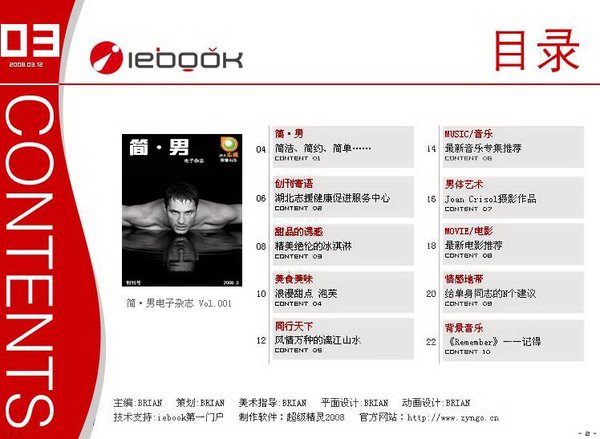 《简·男》电子杂志是于2008年3月诞生的由“旋风创意工作室”独立制作的电子互动媒体。《简·男》电子杂志是一本男性时尚资讯类电子期刊,目标是为同志社群提供更时尚、更全面的资讯平台。《简·男》电子杂志力求成为同志社群了解同志文化、时尚资讯的首选平台。   版权所有:旋风创意工作室   涉及范围:同志文化推广、健康生活方式、时尚前沿资讯、影音推荐