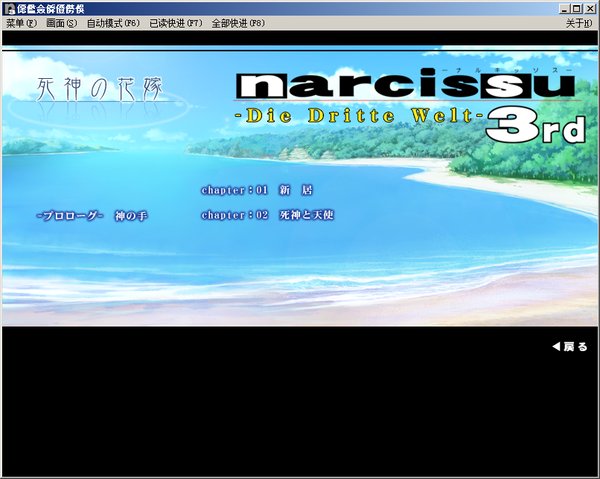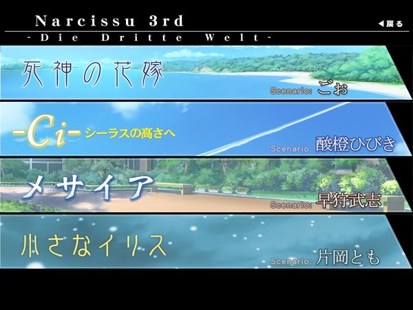 英文名:narcissu 3rd -Die Dritte Welt- 中文名:水仙3 开发制作:STAGE-NANA 发行时间:2009年04月27日 游戏类型:AVG(说白了就是带有剧情选择CG&BGM的电子剧本)