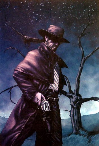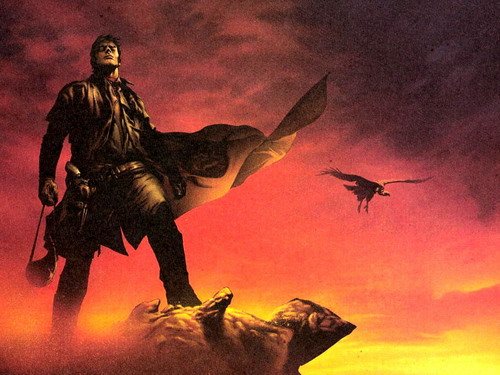 和他过往的作品不同,但又和他本人的创作手法无异的是,黑暗塔融合了多种文学艺术于一身,奇幻,怪诞,离奇,一切的不可思议,光怪陆离的事情都发生在这个黑暗塔的世界--中世界Mid-World当中。这个世界时空交错,既有西部电影元素,也有后现代废土和劫后文明。主角罗兰从他原来的世界“转换” 到了这个世界(这个转换是怎么回事,我就不剧透了),他追寻并赶上了黑衣人,但那不是故事的终点,而是罗兰追寻黑暗塔冒险的真正开始。