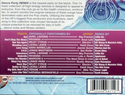 08年米国的Water Music Records 唱片公司出品的舞曲合辑,此为"Dance Party Remix"系列之一,也是最经典的一辑,合辑汇集众多欧美知名DJ,多种风格的舞曲新潮又迅猛,感受一下高科技舞曲时代的来临。