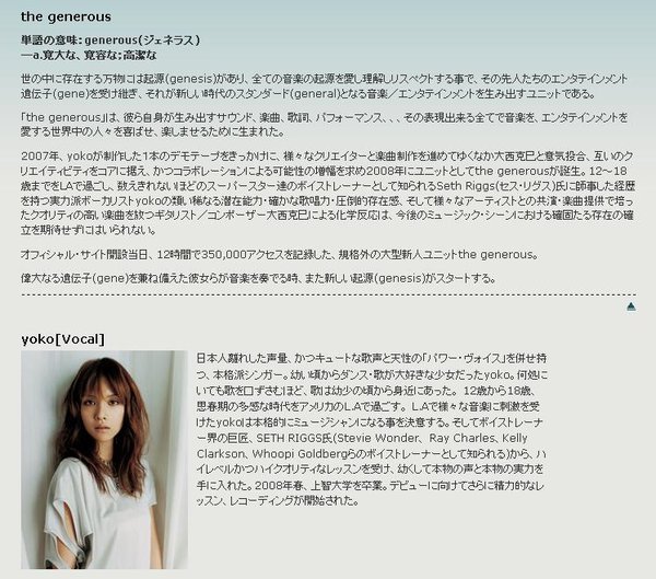 女主唱YOKO的歌声富有有张力,对感情的表现上也是可圈可点。初听可能不是很出彩,但却很值得琢磨的歌声——这正是the generous的特点,就如同那种“第二眼美人”一样,越听越有味道的歌曲,让人越来越想了解他们。